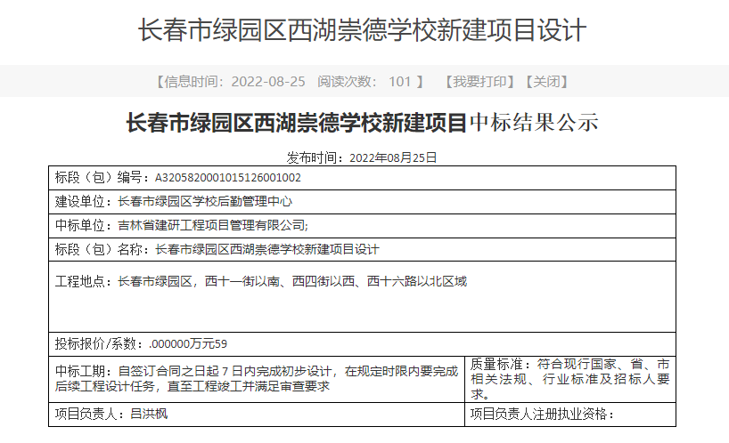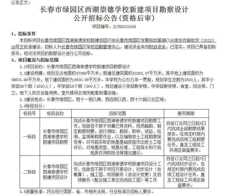 长春市绿园区西湖崇德学校新建项目中标结果公示