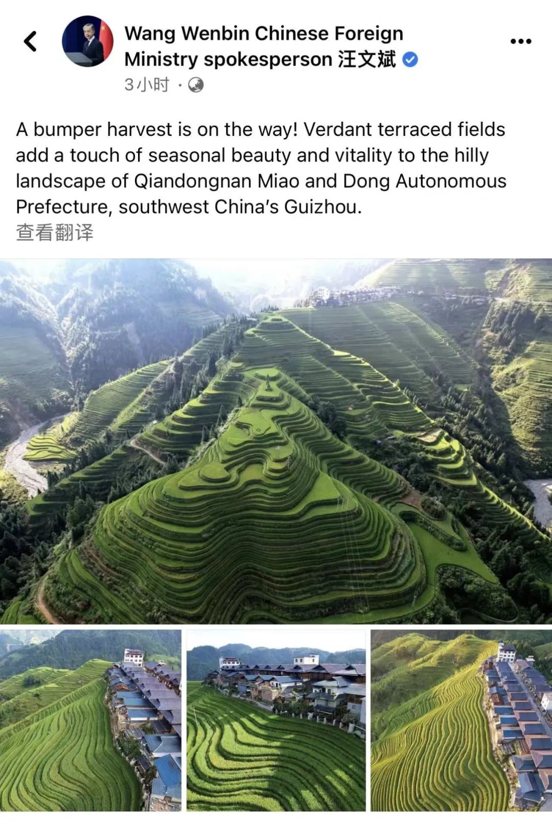 继点赞威宁双龙万寿花田和平塘六硐稻田的丰收美景后,8月24日,外交部发言人汪文斌在个人“脸书”账号再次推介贵州。