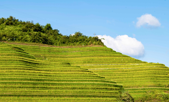 “丰收在即,在中国西南地区贵州省黔东南苗族侗族自治州,梯田之景为丘陵景观增添了季节之美和活力。”