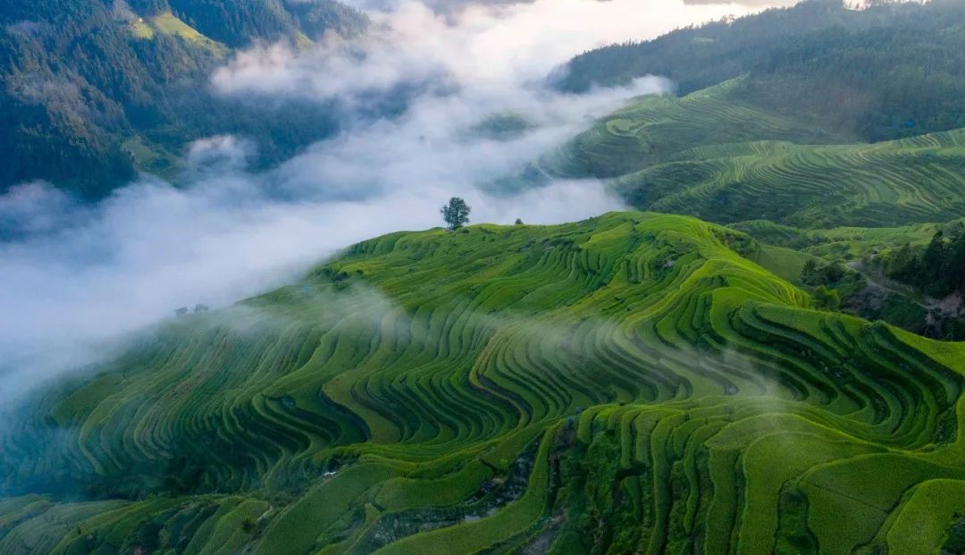 梯田之美是人文之美,也是自然之美。有着“大地指纹”之名的梯田,是当地农耕民族世世代代精心呵护,以及智慧种植所塑形而成的。梯田种稻,稻田里可以养鱼养鸭,稻饭鱼羹,家给人足。每一寸土地,每一株稻苗都沉淀着非凡的智慧。