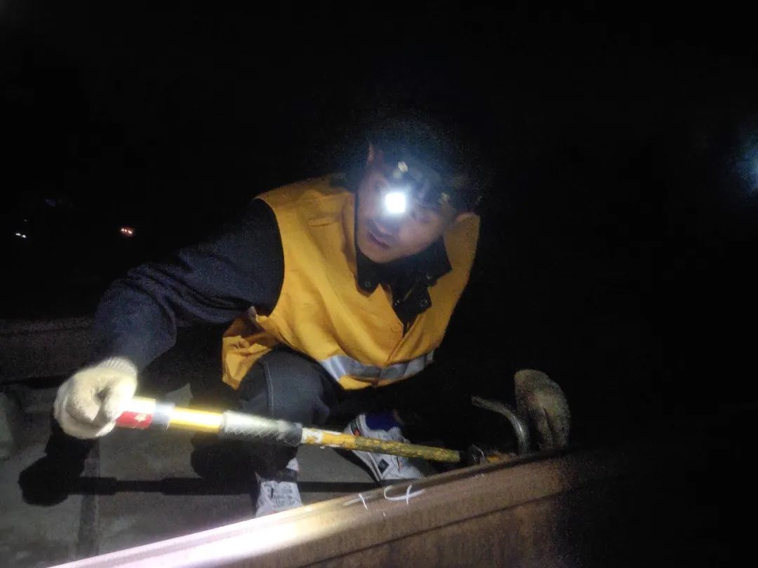 22时整,“天窗”命令准时下达,等候多时的职工们快速进入线路走上桥面。走在最前面的是班长索安多杰,他的小组的主要任务是根据作业方案标注数据计算配料情况。来到作业点,他开始单膝下跪,一手扶着轨面,一手握着石笔,脸几乎贴着混凝土道床板,借助头灯灯光仔细检查轨底垫板。