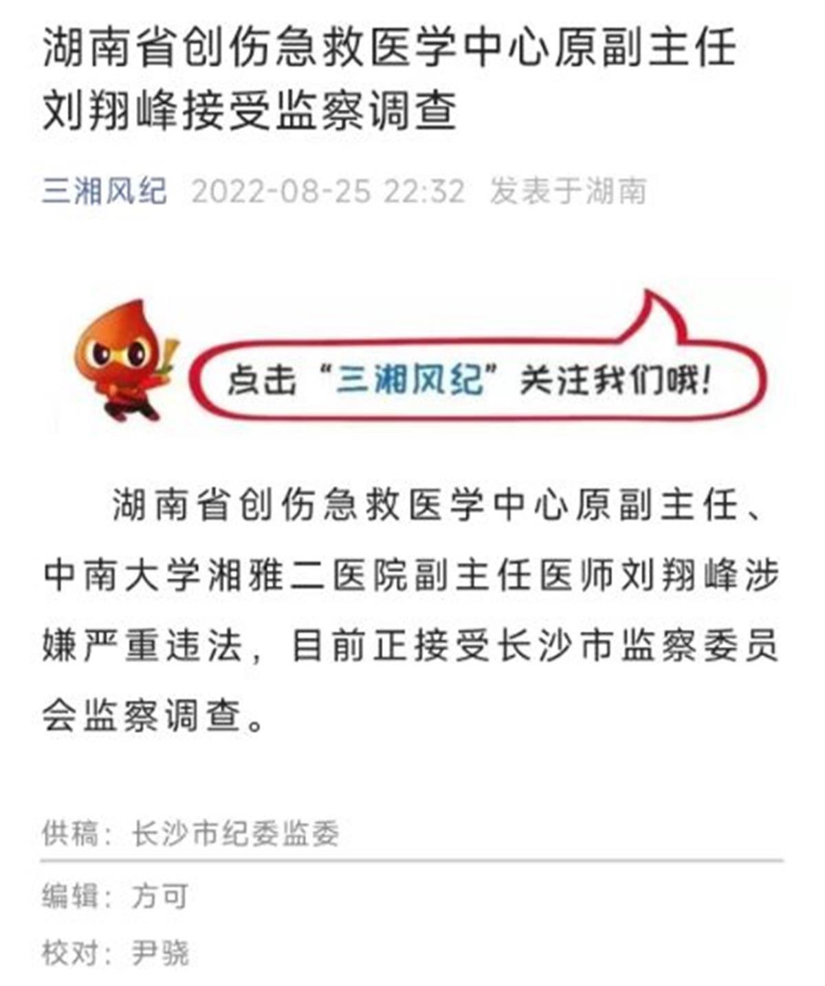 8月25日晚10时32分,湖南省纪委监委官方微信公众号“三湘风纪”发布了《湖南省创伤急救医学中心原副主任刘翔峰接受监察调查》的通报。通报称,湖南省创伤急救医学中心原副主任、中南大学湘雅二医院副主任医师刘翔峰涉嫌严重违法,目前正在接受长沙市监察委员会监察调查。