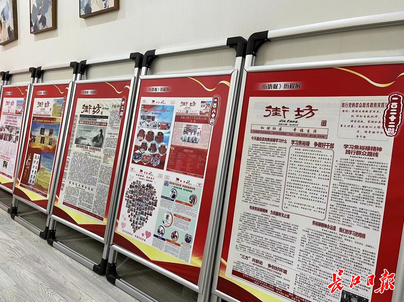 扬子社区《街坊》200期分享会上,一排排《街坊》沿墙摆放。 记者刘晨玮 摄