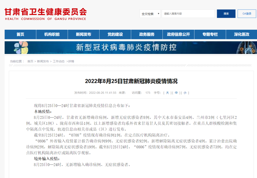 现将8月25日0—24时甘肃省新冠肺炎疫情信息公布如下: