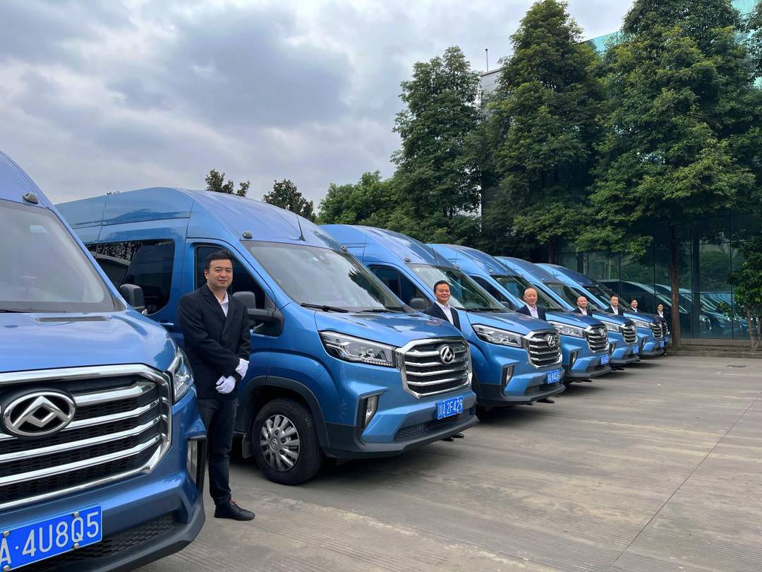 9座蓝色车身商务车,上门接送,12元就能直达成都驷马桥地铁站。