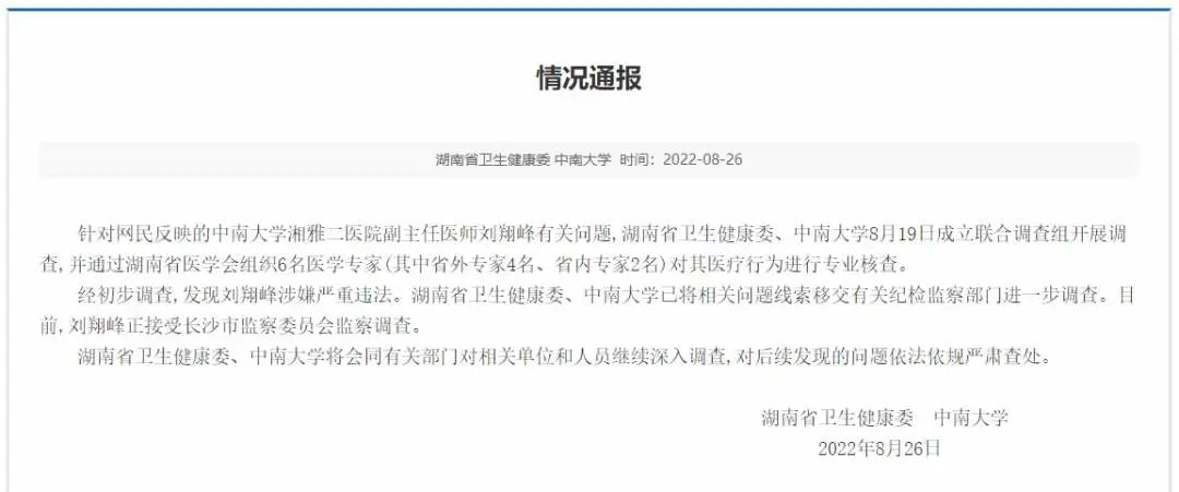 湖南卫健委网站8月26日消息,湖南省卫生健康委、中南大学通报,针对网民反映的中南大学湘雅二医院副主任医师刘翔峰有关问题,湖南省卫生健康委、中南大学8月19日成立联合调查组开展调查,并通过湖南省医学会组织6名医学专家(其中省外专家4名、省内专家2名)对其医疗行为进行专业核查。