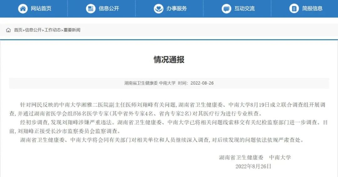 据湖南省卫生健康委和中南大学8月26日晚通报,针对网民反映的中南大学湘雅二医院副主任医师刘翔峰有关问题,湖南省卫生健康委、中南大学8月19日成立联合调查组开展调查,并通过湖南省医学会组织6名医学专家(其中省外专家4名、省内专家2名)对其医疗行为进行专业核查。