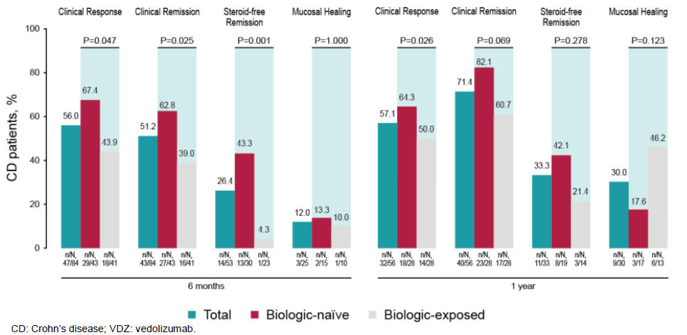 图1 维得利珠单抗治疗CD患者6个月和1年的临床疗效
