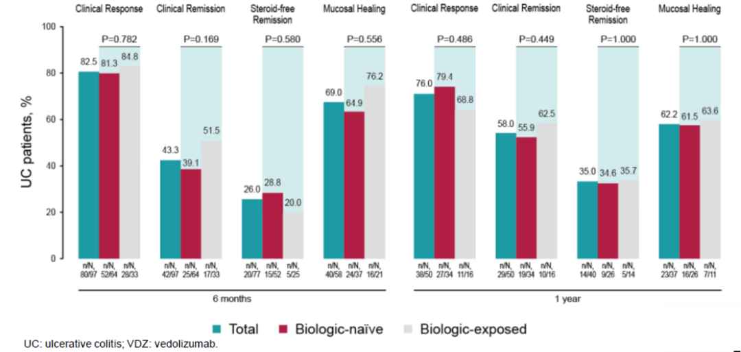 在维得利珠单抗治疗6个月时,生物制剂初治CD患者的疗效(CRS、CRM、SRM)显著优于生物制剂经治患者。治疗1年时,生物制剂初治组比生物制剂暴露组具有更高的CRS(82.1%vs.60.7%,p=0.026)(图1)。在UC患者中,生物制剂初治组和生物制剂暴露组之间的有效性没有明显差异(图2)。