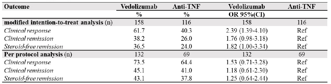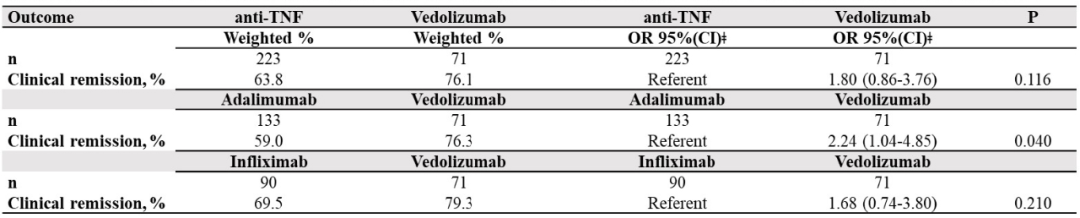 表2 比较维得利珠单抗和抗TNF-α在初始生物制剂治疗CD患者中的1年疗效[6]