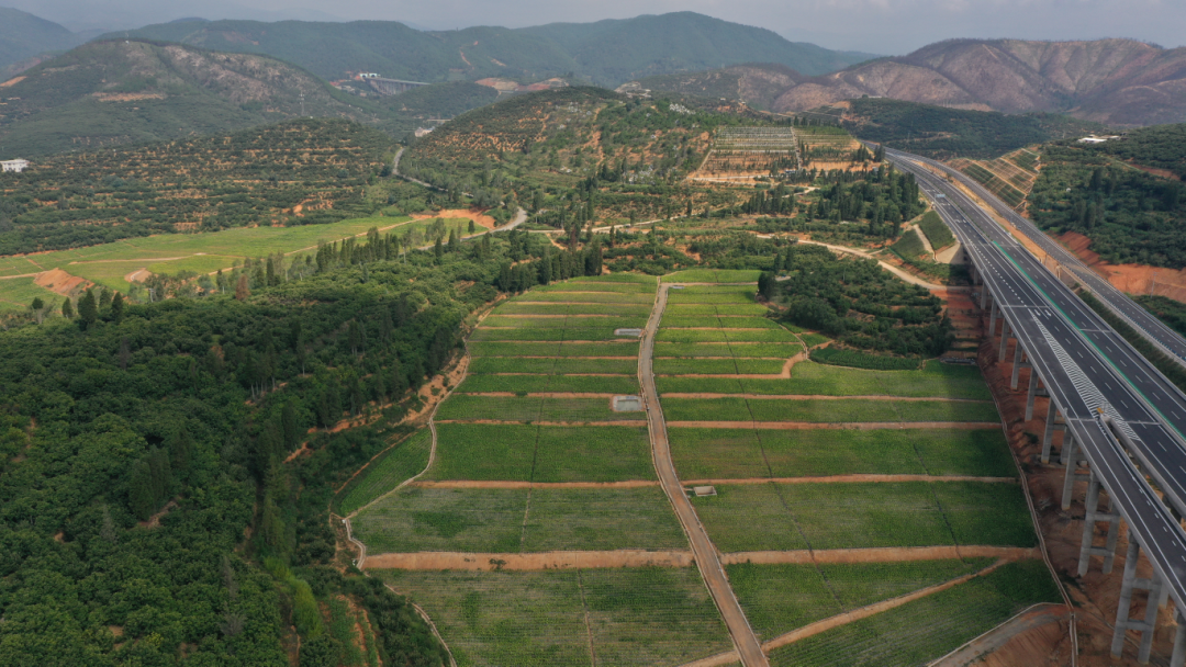 在4年多时间建设期间,中国中铁各参建单位依山就势、借景造景,降低资源消耗,完成边坡绿化面积共42万平方米,对700余亩弃土场进行就地复垦和绿化。原本的荒山、荒滩,如今披上了绿装,弃土场也变成了肥沃的农田。为保留区域生物多样性,建设者不断优化方案,有效规避了峨山县玉林泉水资源保护地、易门县大龙口水源保护地、易门龙泉自然保护区。此外,通过细致的市场调查及属地环境分析,玉楚高速综合选择了耐旱、喜光等多种符合云南省特殊气候条件的植物作为绿化植物。在中央分隔带以塔柏作为主要防眩树种,而且为了丰富路域内景观变化,每隔10株塔柏点缀一株紫薇或紫荆。