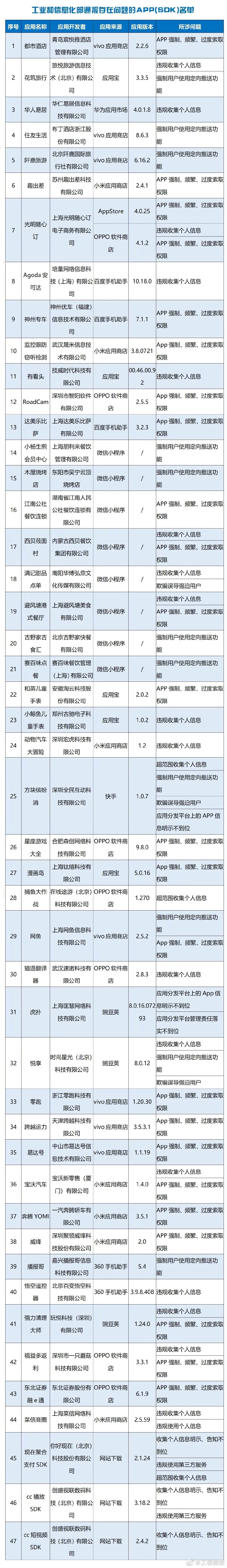 依据相关法律法规,工信部组织第三方检测机构对群众关注的酒店餐饮类、未成年人应用类等APP及SDK进行检查,对发现存在侵害用户权益行为的共227款APP和SDK提出整改要求。截至目前,尚有47款APP和SDK未按要求完成整改。工信部对这些APP和SDK进行通报,要求在9月5日前完成整改落实工作。逾期不整改的,工信部将依法依规组织开展相关处置工作。
