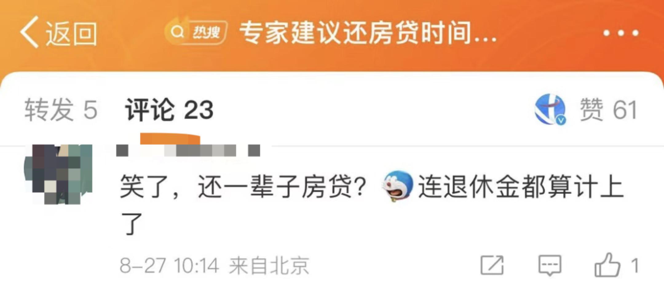 中新经纬8月27日电 (王玉玲 魏薇)27日,“专家建议还房贷时间延长至40年”话题登上微博热搜第一。北师大房地产研究中心主任董藩在接受媒体采访时表示,为减轻年轻人的买房负担,可以通过降低首付的比例、前五年只还利息、延长还贷时间等措施来实现。该言论引发网友热议,你怎么看?