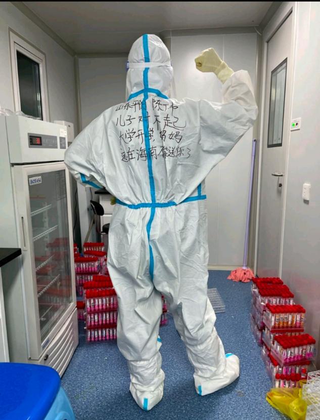 “每天,伴着实验室的机器轰鸣,伴着排列如墙的标本箱,我们穿着严密厚实的三级防护,在实验室里挥汗如雨,加样、提取、扩增,周而复始;烈日下,志愿者们步履不停地奔忙在5个舱之间,扫码登记、运送标本、传递物料。每个人都在自己的岗位上忘情地挥洒着汗水与激情。有时候禁不住扪心自问:苦吗?苦;累吗?累;值吗?值!能停下来吗,不能!”