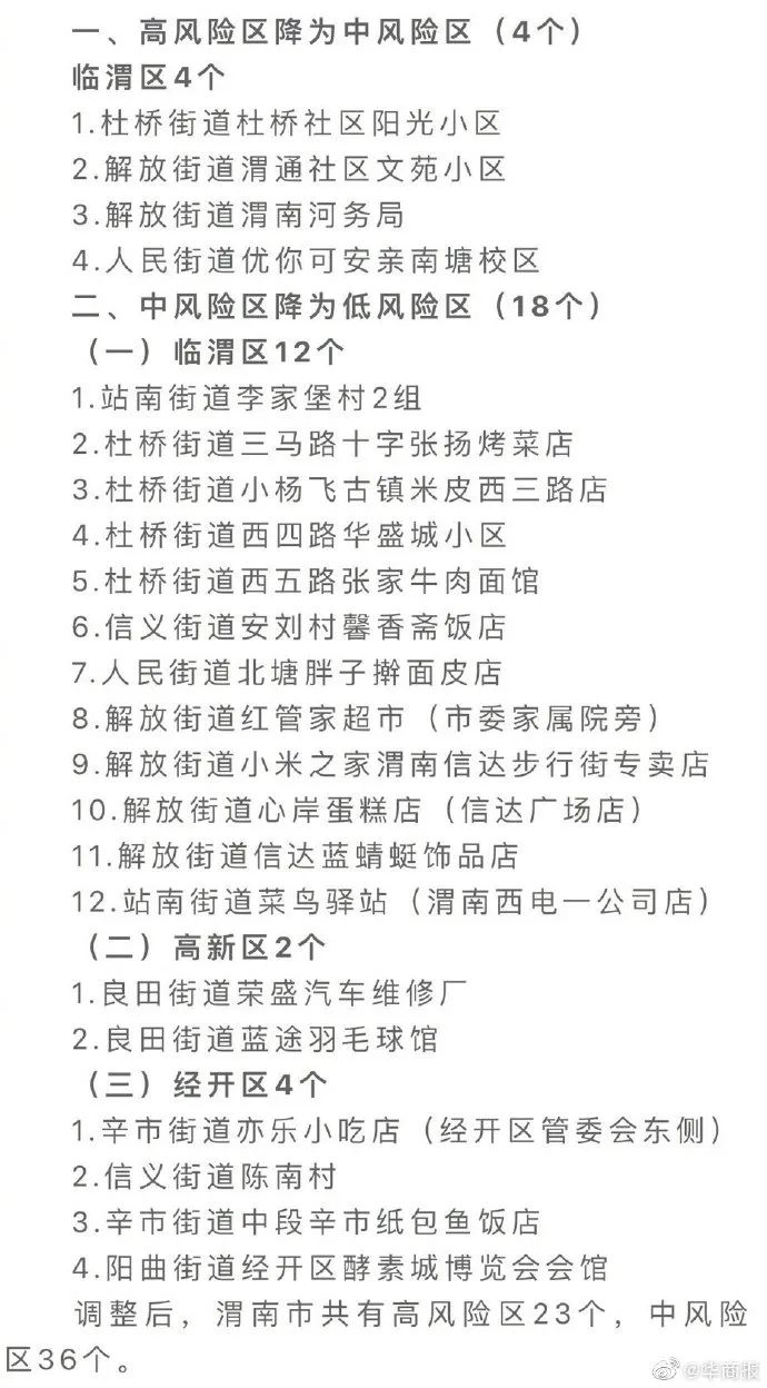自2022年8月27日0时起,渭南市4个高风险区降级为中风险区,18个中风险区降级为低风险区。