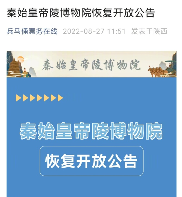 “兵马俑票务在线”8月27日11:51发布公告:根据最新疫情防控工作安排,秦始皇帝陵博物院在做好疫情常态化防控的同时于2022年8月28日(明日)起恢复开放。
