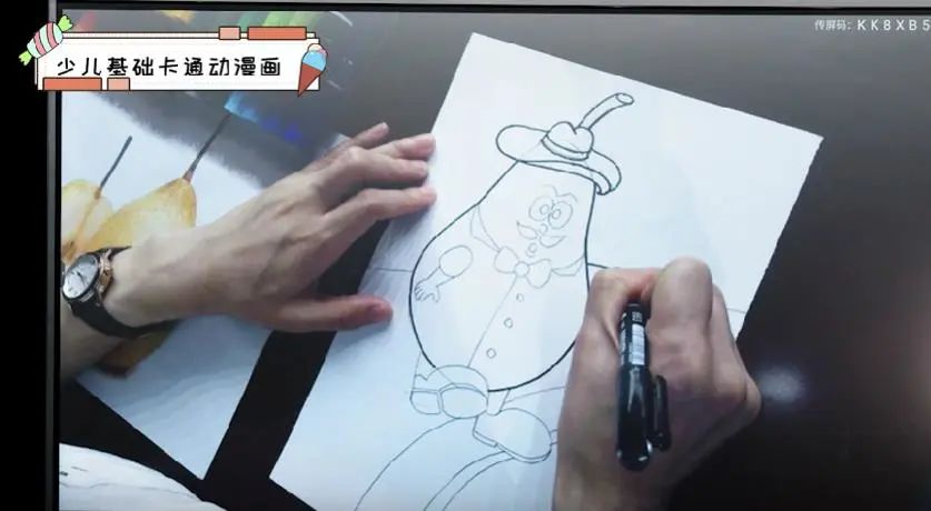 用水果——“梨”,创作一位中年大叔的动漫形象。首先用铅笔画出梨的形象,加上帽子、眼睛、表情、胡子,再画上一身正式的衣服