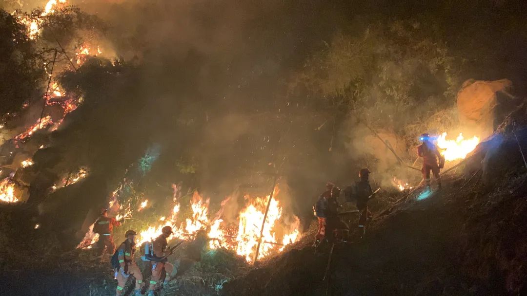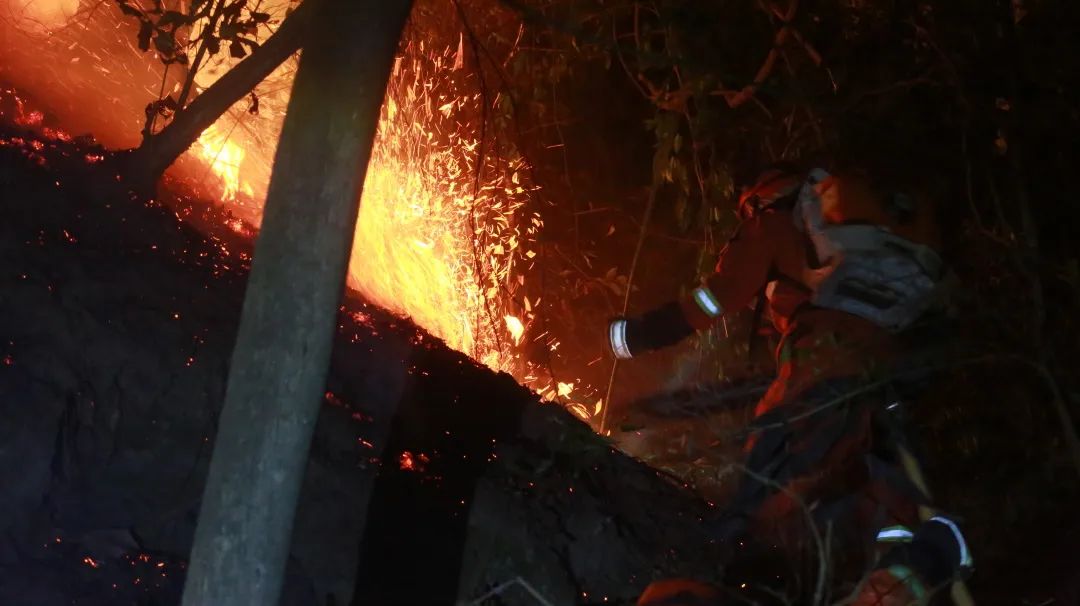 昨晚是联合作战,森林消防救援总队50人在前,消防武警、群众志愿者在后,配合沿线布开。“我们在前面点烧,火势大的压制,保证按预定区域燃烧;火势小的助燃,使整个点烧的火势在控制范围之内。”