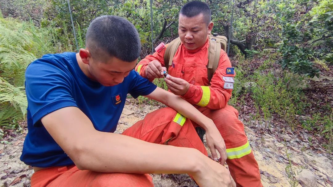 “朱家柱人呢?让他给咱火线上送一些降温冰袋过来!”昆明支队石林中队指导员赵明奇向身边的指战员问起来。朱家柱加入森林消防队伍前学的是医学专业,来到队伍后长期在卫生员岗位工作。这次增援重庆火场,由于火场温度过高,为了防止队员出现中暑或热射病等症状。出发前,朱家柱就带足了降温冰袋、防暑药品。到达火场后,朱家柱为每名指战员发放了藿香正气水、仁丹等防暑药品。在火线上,朱家柱也一刻停不下来,不停在不同火线间询问关心战友并挨个过问是否吃了防暑药。除了卫生员,朱家柱还有一个身份就是战斗员。在担任北碚区火场西线火头扑打任务中,由于水泵出现故障,作为水泵手的他赶紧放下发放药品的工作,拿着维修工具抢修水泵。为了防止水泵再次故障,他就一直守在水泵旁边,直到火头彻底扑灭才跟着战斗队员一起回到休整地域。朱家柱放下修理工具往身边的土堆上一靠就立马睡了过去,一班长刘瀚元想找他要两个降温冰袋,忙被中队长拦了下来:“别去,两天一夜,家柱总共眯了两个小时不到,让他睡会,冰袋我找其他人给你拿。”