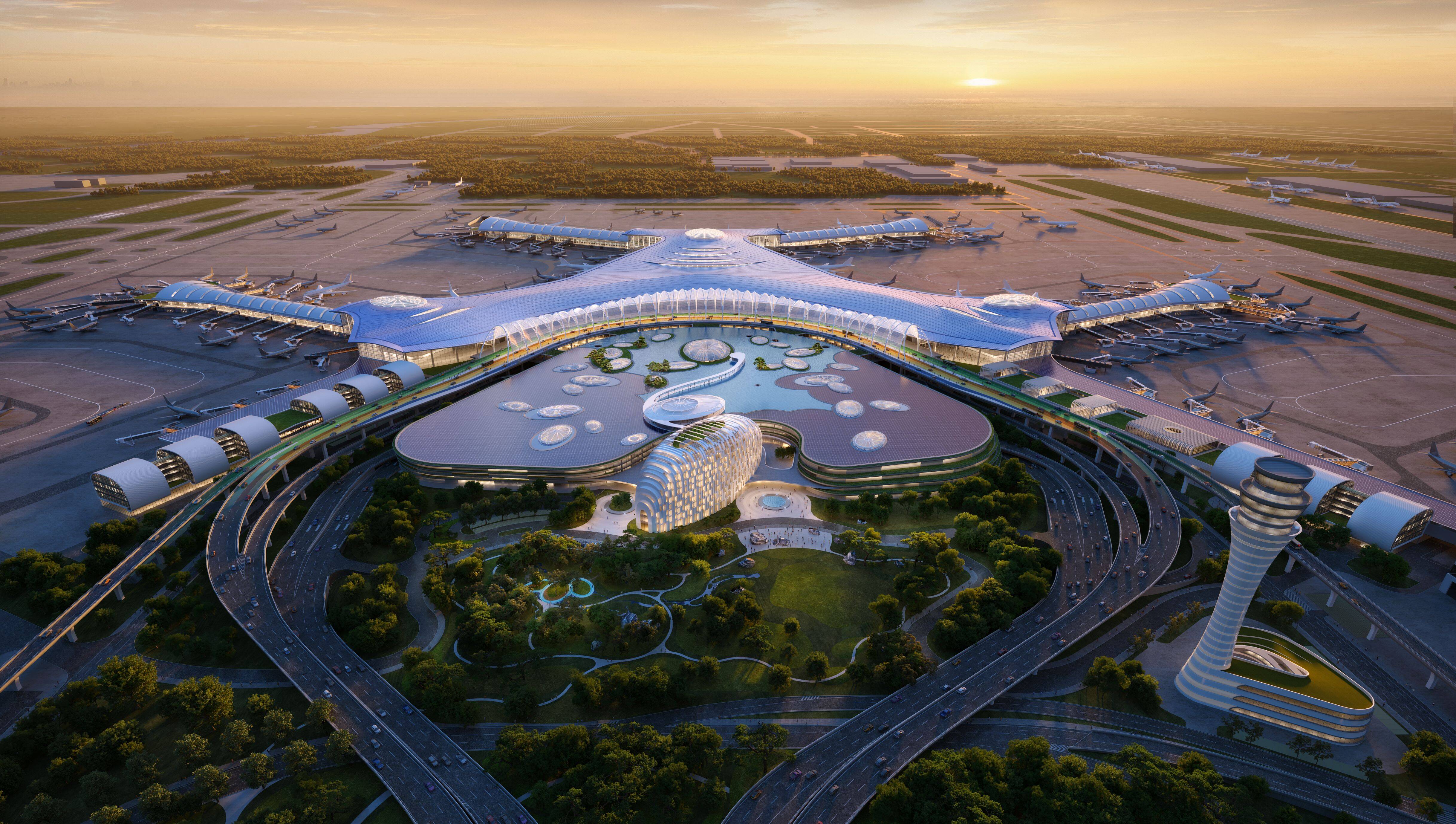 项目高起点擘画总体规划和建设方案,由中国工程院崔愷院士和何镜堂院士团队,联合民航规划设计研究总院、新加坡樟宜机场署等国内外顶尖设计团队,开展航站区、飞行区、工作区规划设计,以建设平安、绿色、智慧、人文“四型机场”为目标,大量采用新材料、新工艺和绿色低碳技术,全力打造国内领先、国际一流,彰显山东特色、体现齐鲁风韵的城市新地标。T2航站楼采用创新性六指廊构型,呈大集中、小分散布局,向心环抱、分段落客、分区值机、分区安检,构建智慧管理、智慧引导、智慧安保全方位智慧机场体系,为旅客提供高效、个性、安全的出行体验。同时,引入枢纽+服务、枢纽+公园、枢纽+园区、枢纽+物流、枢纽+增长点的“1+5”港产城融合发展新模式,与临空经济区、综合保税区等一体规划设计、联动发展。