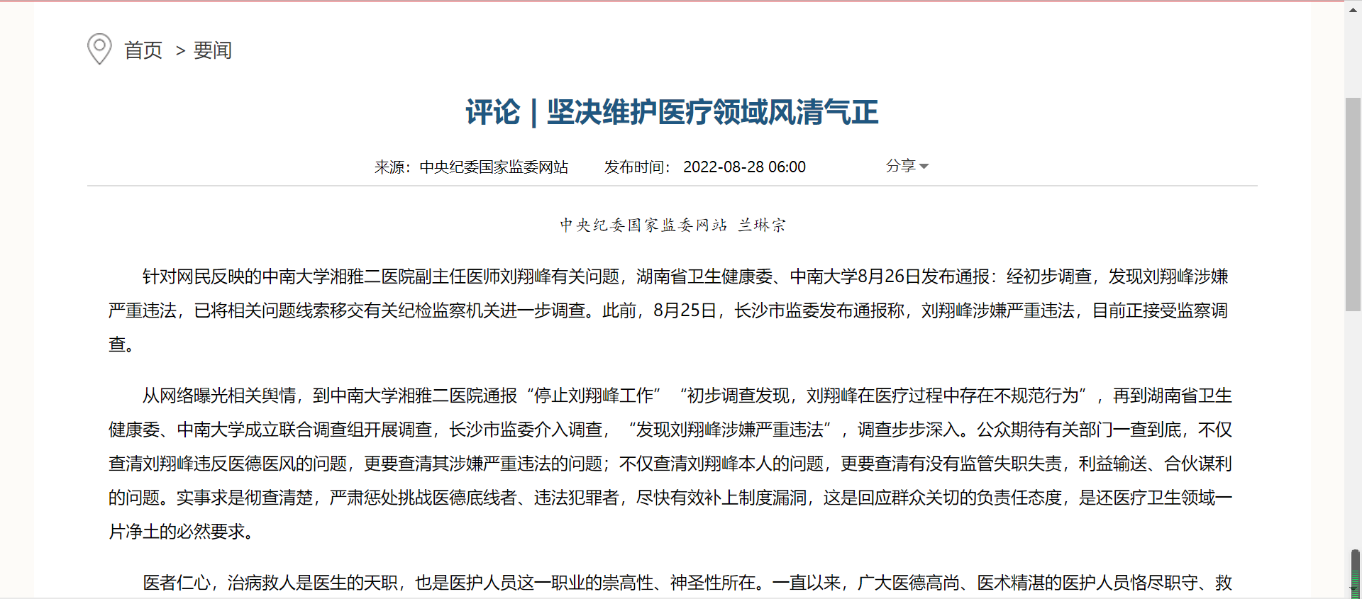 从网络曝光相关舆情,到中南大学湘雅二医院通报“停止刘翔峰工作”“初步调查发现,刘翔峰在医疗过程中存在不规范行为”,再到湖南省卫生健康委、中南大学成立联合调查组开展调查,长沙市监委介入调查,“发现刘翔峰涉嫌严重违法”,调查步步深入。公众期待有关部门一查到底,不仅查清刘翔峰违反医德医风的问题,更要查清其涉嫌严重违法的问题;不仅查清刘翔峰本人的问题,更要查清有没有监管失职失责,利益输送、合伙谋利的问题。实事求是彻查清楚,严肃惩处挑战医德底线者、违法犯罪者,尽快有效补上制度漏洞,这是回应群众关切的负责任态度,是还医疗卫生领域一片净土的必然要求。