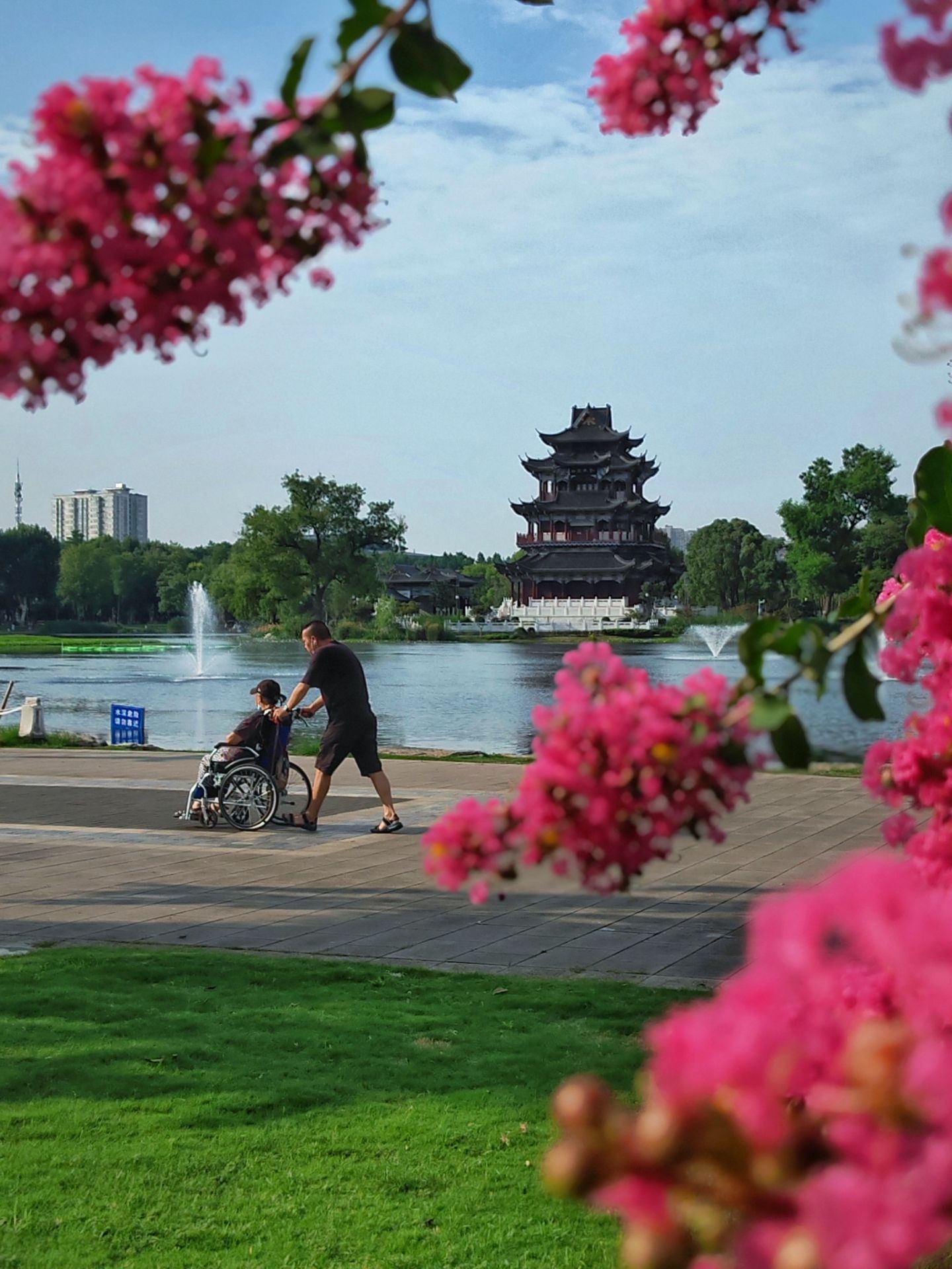 趁清晨气温稍低,推着老人到紫阳公园散步的市民。城市摄影队@风姿