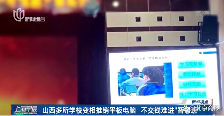 近日,新华视点的记者在跟随国务院第九次大督查在山西省调研时发现,当地多所学校以是否购买平板电脑为标准,划分“智慧班”和普通班。进入“智慧班”,需一次性缴纳课程资源费、平板使用费等数千元。不少家长虽然心有抵触,但为了让孩子分个好班,只好硬着头皮掏腰包。据估算,2017年至今,太原市近5000名学生购买了相关公司的"智慧课堂"服务,共收费约2400万元。