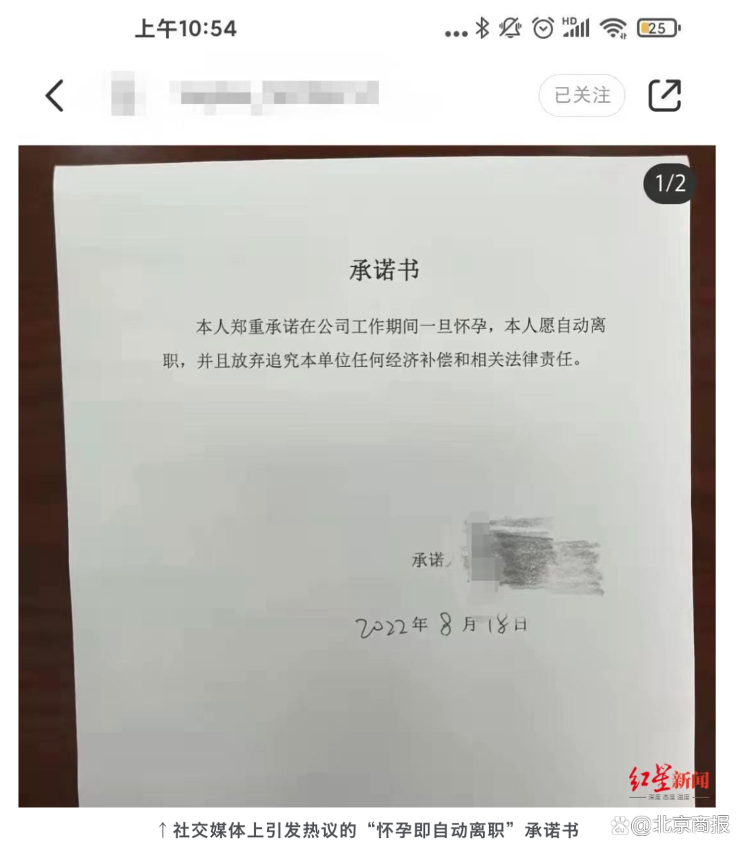 据红星新闻消息,日前,一封公司要求一旦怀孕自动离职的公司免责承诺书在社交媒体上引发关注。承诺书上写道:“本人郑重承诺在公司工作期间一旦怀孕,本人要自动离职,并且放弃追究本单位任何经济补偿和相关法律责任。”记者联系到发帖的该名女员工,她肯定这封承诺书情况属实。