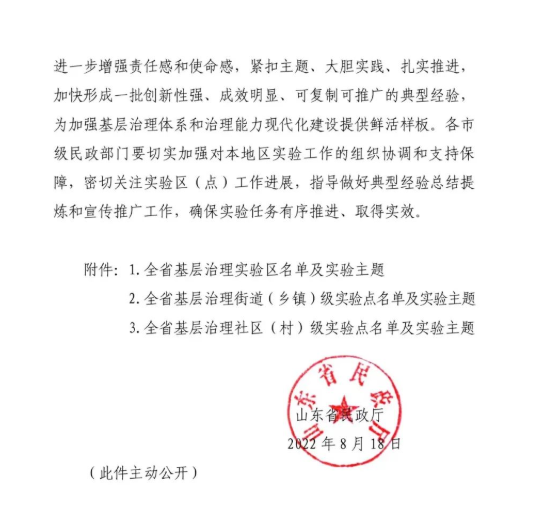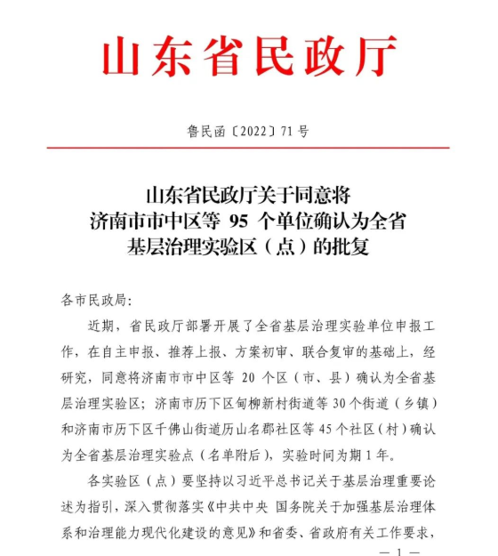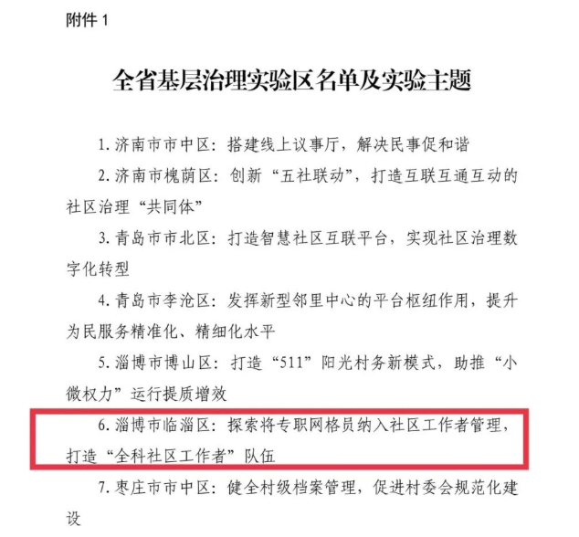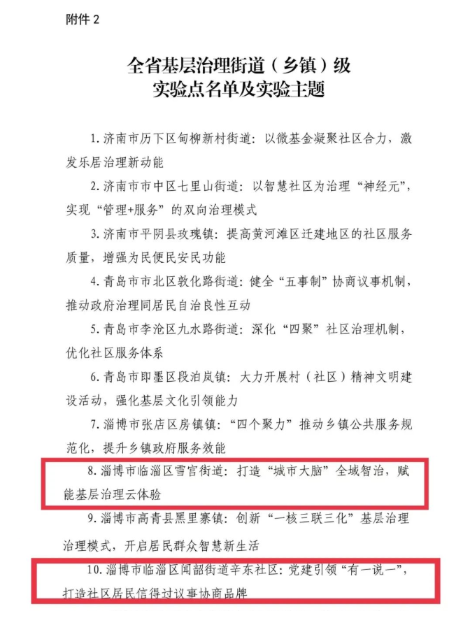 2022年8月18日,省民政厅批复全省基层治理实验区(点),临淄区、雪宫街道和闻韶街道辛东社区3个单位均入选,