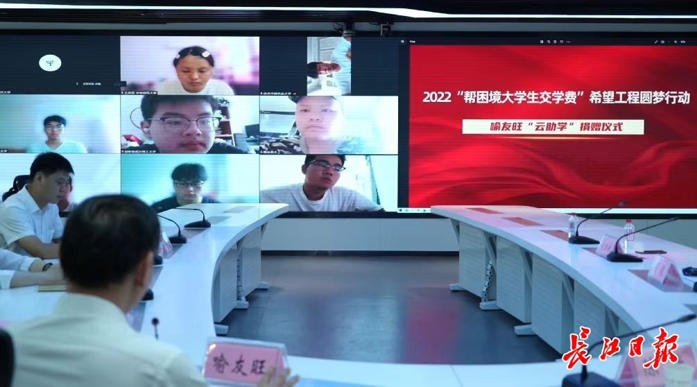 长江日报大武汉客户端8月28日讯(记者唐婧妮 通讯员揭兴旺)大屏幕上,是一张张年轻的脸庞,他们聚精会神,频频点头,听到激动处,会不自觉地鼓起掌来。这是2022年“帮困境大学生交学费”希望工程圆梦行动暨喻友旺“云助学”捐赠仪式现场。8月28日上午,50名受助学生代表、20名长报新入职员工通过“云端”参会。
