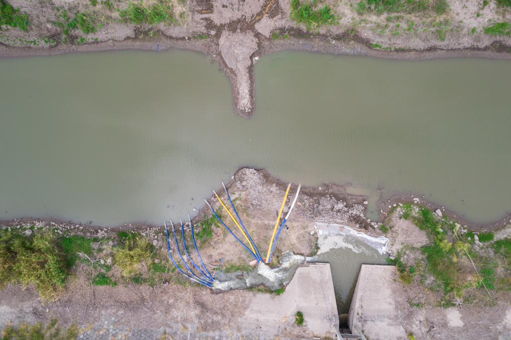 湖南省常德市安乡县三岔河镇的一处提水作业点(无人机照片)。新华社记者 陈思汗摄