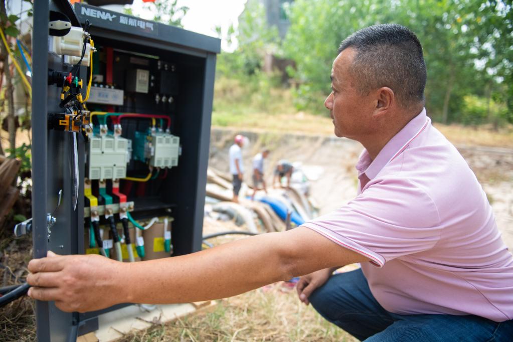 周刚在罗洲电排检查配电箱。新华社记者 陈思汗摄