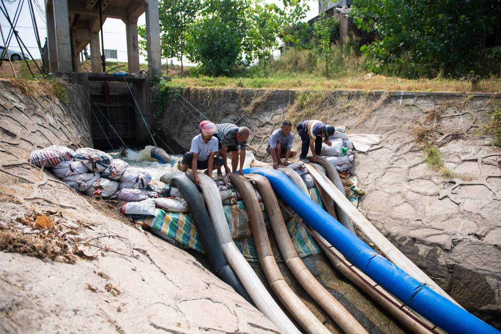 村民在水管站工作人员指导下调整水管位置。新华社记者 陈思汗摄