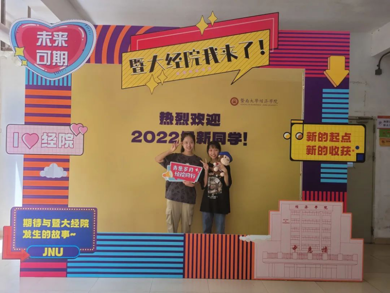 迎新期间,暨南大学各学院结合专业特点开展系列特色迎新活动,包括迎新横幅、创意展板、新生礼包等,为新生培养专业兴趣,帮助他们开启美好的学习旅程。