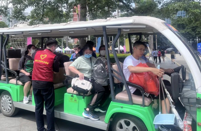 为了避免人员过度集中,学校提前对迎新线路进行了规划设计,对入校流程做了整体布局。线下来校报到的新生们,按照疫情防控的要求,出示48小时核酸证明、健康码、行程卡绿码,及提前14天健康打卡材料等,经过测温后即可进入排队区等候乘坐转运电瓶车抵达宿舍。因疫情防控原因或其他特殊原因暂时无法来校报到的新生,也可通过线上途径快速完成线上报到。