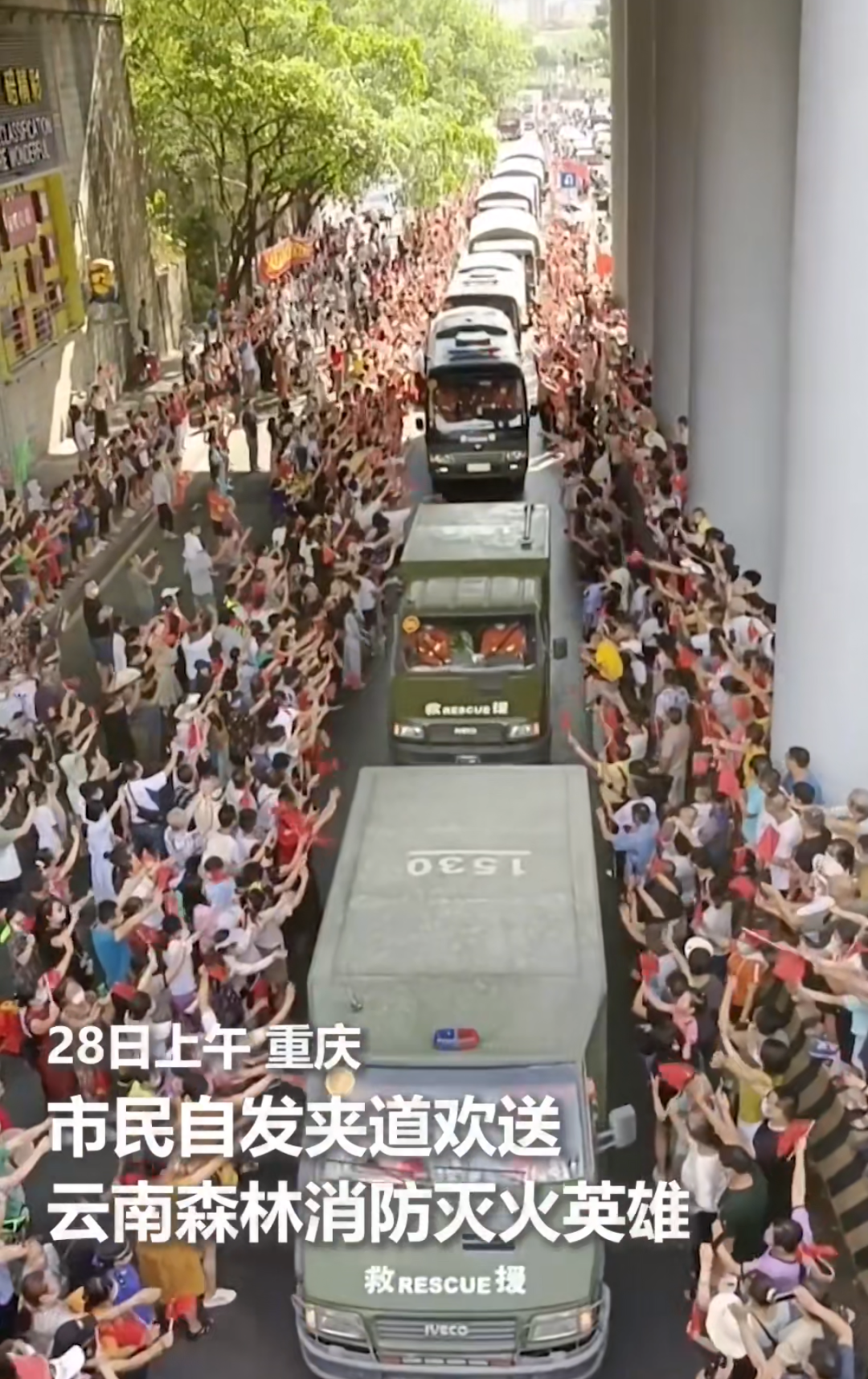 云南省森林消防总队、四川省森林消防总队、应急管理部南方航空护林总站、甘肃省森林消防总队陇南支队共派出1000余名指战员驰援重庆,深入涪陵、北碚、巴南、江津、南川、大足、璧山、铜梁等地,连续多昼夜遂行灭火任务,他们不畏艰险、冲锋在前,逆火而行、连续奋战,为扑灭山火作出了突出贡献,充分彰显了新时代应急铁军的忠诚担当,与重庆人民共同谱写了一曲感人肺腑的大爱之歌,在全社会引起强烈反响。