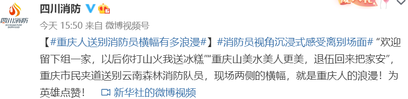 为强化榜样引领,褒扬先进典型,礼赞救火英雄,进一步激发广大干部群众以昂扬向上的精神状态奋进新征程、建功新时代,市委宣传部、市文明办决定,授予云南省森林消防总队、四川省森林消防总队、应急管理部南方航空护林总站、甘肃省森林消防总队陇南支队等4个集体“感动重庆”特别奖。