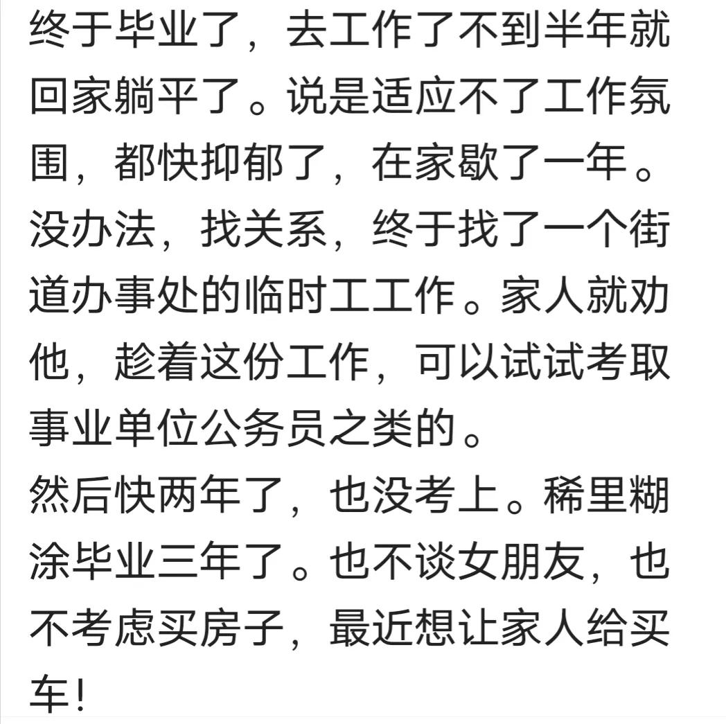 好不容易玩到毕业了,孩子工作不到半年说适应不了工作氛围,竟抑郁了,回家一躺就是一年。