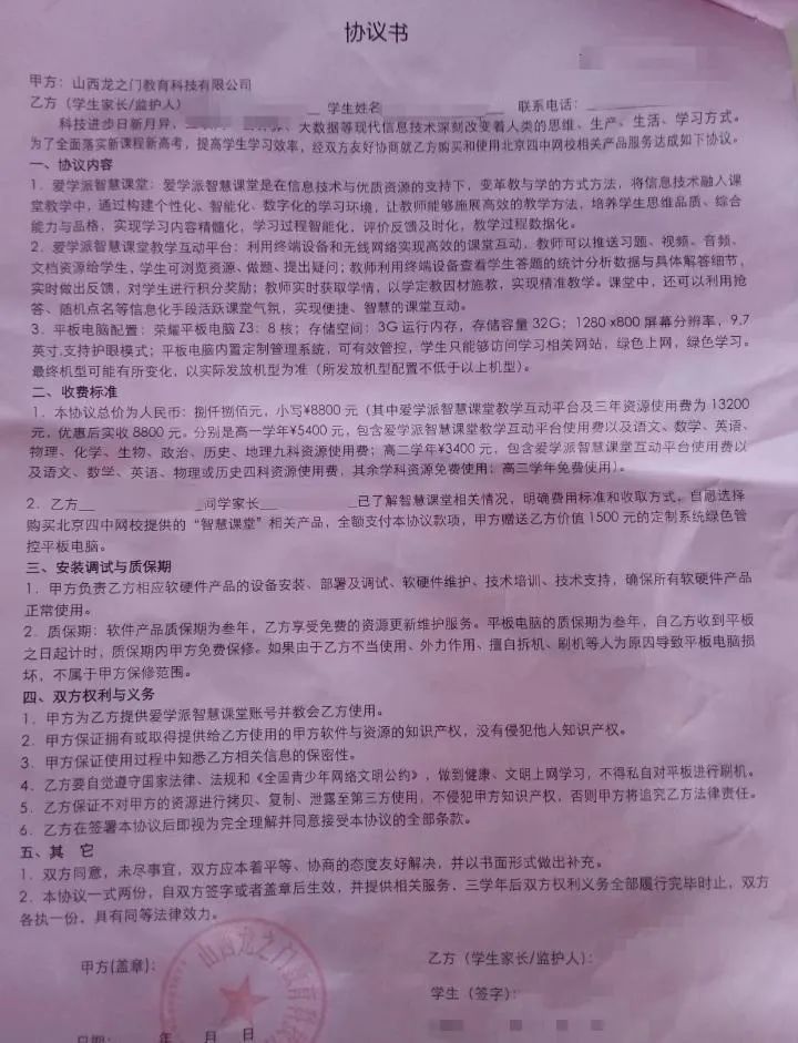 家长与第三方公司签署的协议。(国务院第九次大督查第一督查组供图)