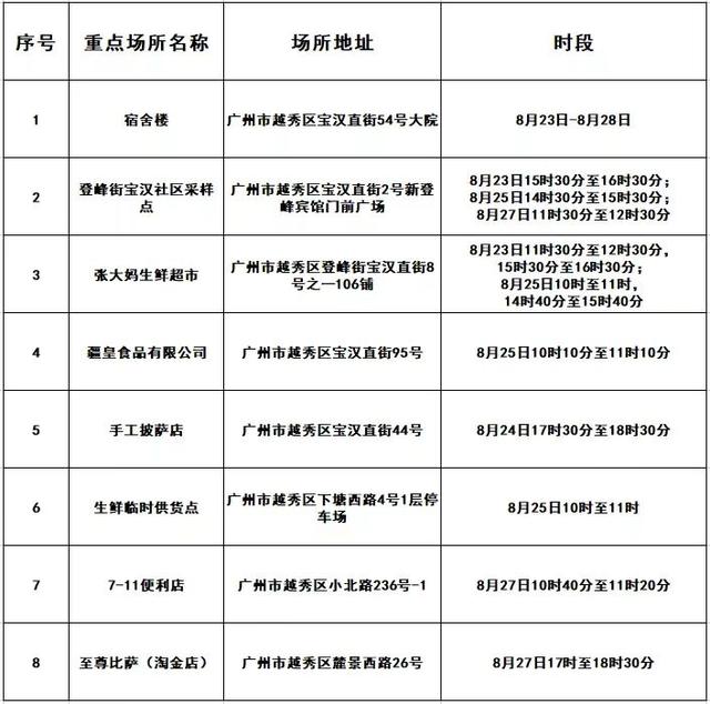 记者8月28日晚从广州市越秀区获悉,因疫情防控需要,请在相关时段到过以下重点场所的人员,立即向所在社区报备,开展“七天三检”自我健康监测,并配合做好疫情防控措施。重点场所名单见下表: