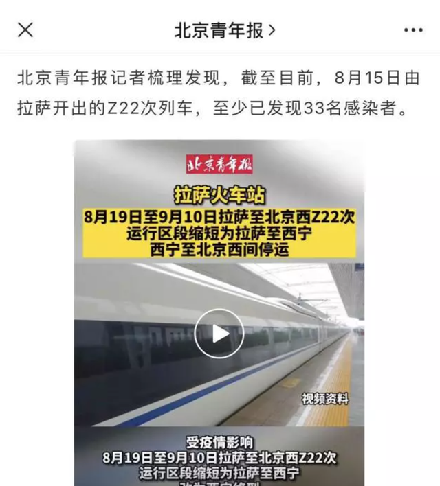 据北京青年报统计,截至8月20日,8月15日从拉萨开出的z22次列车,至少发现了33名感染者。