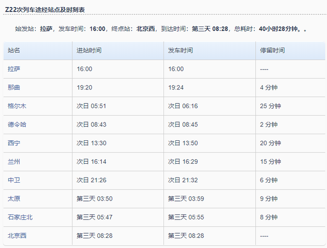 Z22次列车由西藏拉萨站开往北京西站,共有10站,全程耗时约40小时28分钟,途经多个省份。