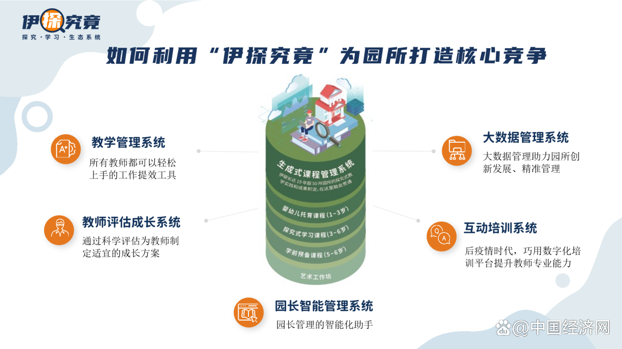 产品方面,基于创新性的SaaS服务系统,伊探究竟突破传统纸质教案的各项壁垒,主打“探究式课程+园所数字化管理平台”的核心优势,提供以探究性生成式课程管理系统为中心,园长智能管理系统、教学管理系统、互动培训系统、教师评估成长系统和大数据管理系统为辅助的一体化平台,为托育机构和幼儿园备课、教研、运营、培训、招生、管理等各关键环节提供完整的闭环服务。