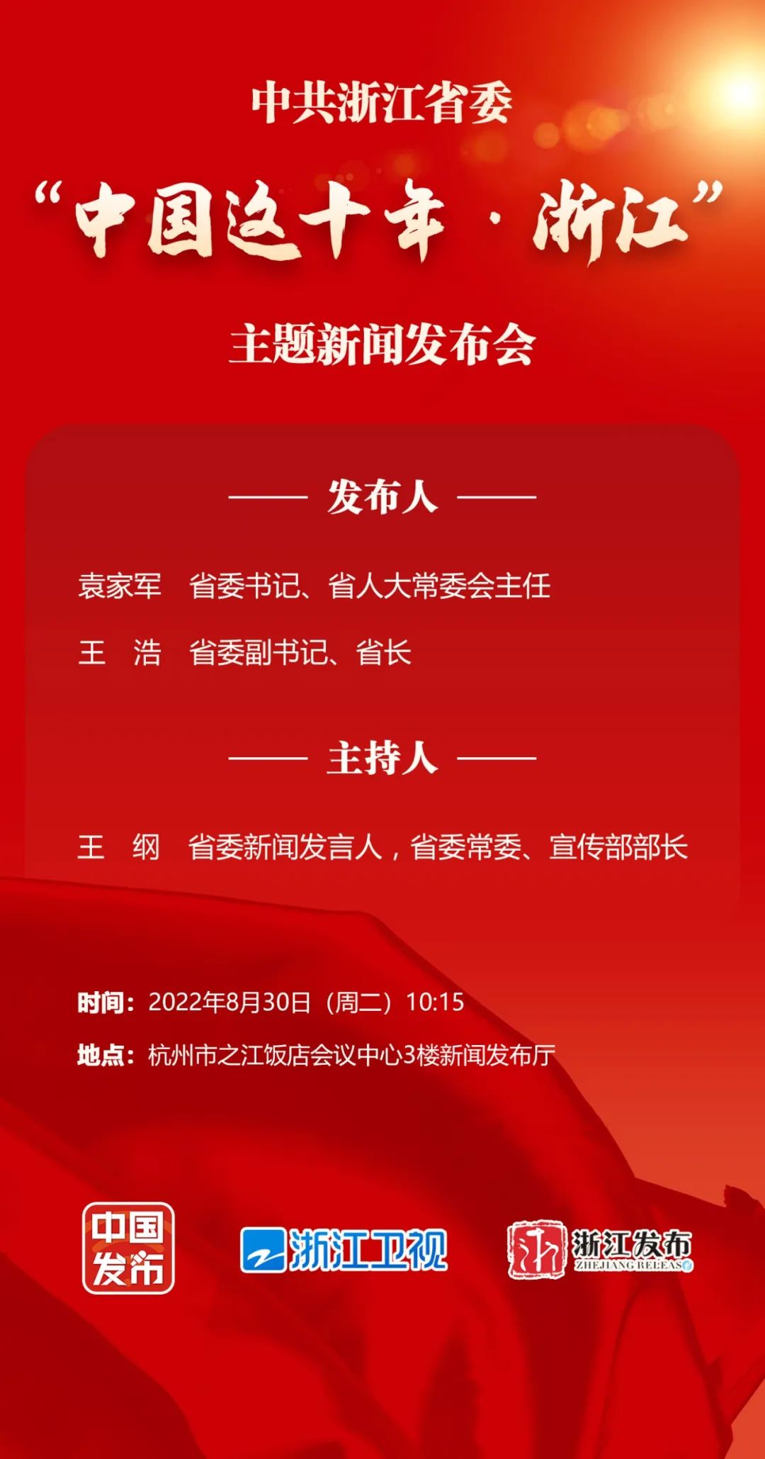 中共浙江省委将召开“中国这十年·浙江”主题新闻发布会。发布会定于8月30日(周二)10:15在杭州举行,请省委书记、省人大常委会主任袁家军,省委副书记、省长王浩介绍有关情况并回答记者提问。