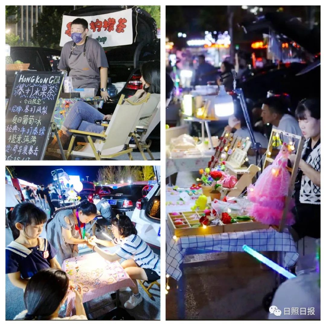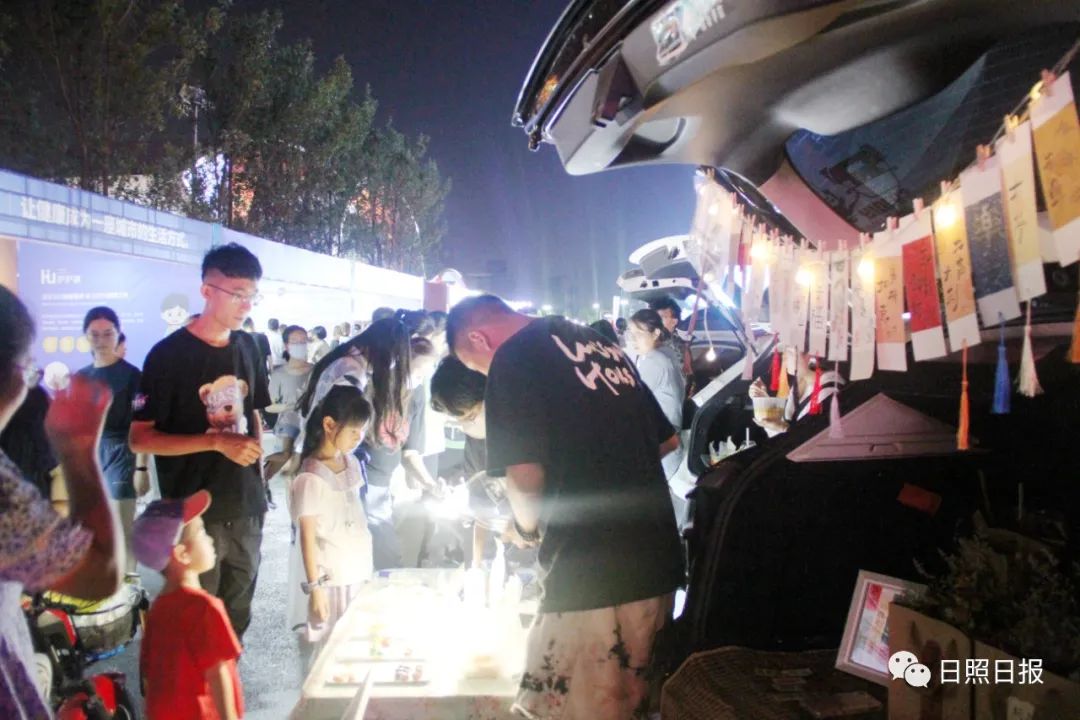欣赏完舞台表演,再买点东西。在后备箱集市、跳蚤市场,璀璨的小夜灯闪闪发亮,各具特色横幅挂起,各式私家“宝贝”正在出售。头戴编制发卡的小姐姐编织出可爱的小兔,刚出锅的梅花小蛋糕香气喷喷,还有特色水果茶、泰式糕点,以及各种玩具、各色手链等多种产品现场售卖。