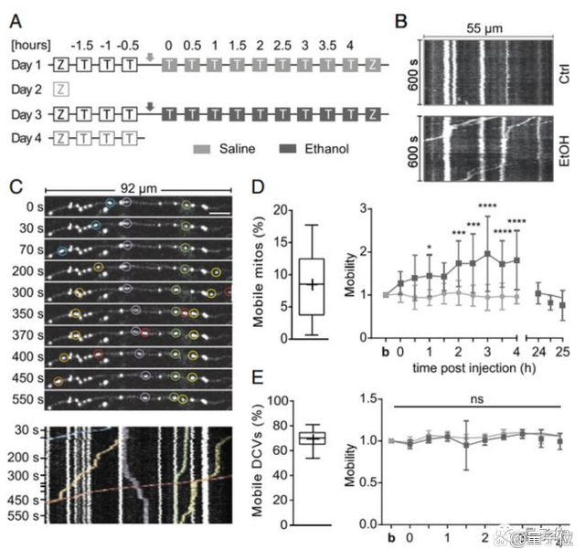 他们用双光子显微镜成像观察到,酒精摄入后线粒体迁移也受到了干扰,这一结果使上述的离体实验结果在活体小鼠的大脑中得到了很好的再现。
