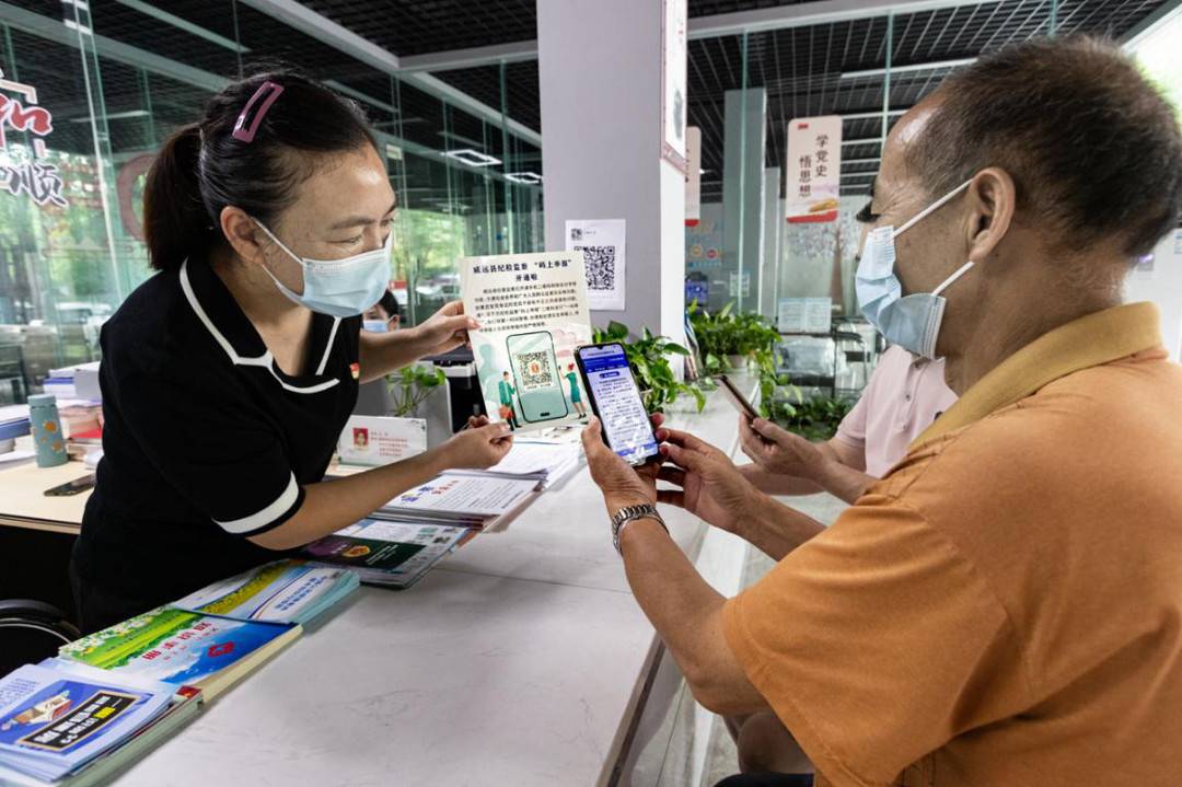 图为威远县严陵镇滕家坝社区纪检委员王萍向群众介绍“码上举报”的操作流程。