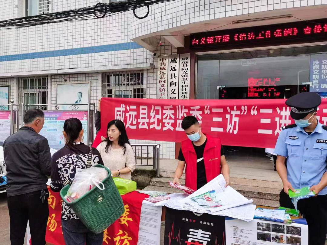 图为威远县纪委监委干部在向义镇开展接访活动,向群众发放信访举报宣传资料。