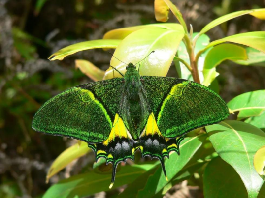 金斑喙凤蝶,体长30毫米左右,前翅长约55毫米,翅展81-93毫米,是一种大型凤蝶。它的翅上鳞粉闪烁着幽幽绿光。前翅上各有一条弧形金绿色的斑带;后翅中央有几块金黄色的斑块,后缘有月牙形的金黄斑,后翅的尾状突出细长,末端一小截是金黄色。