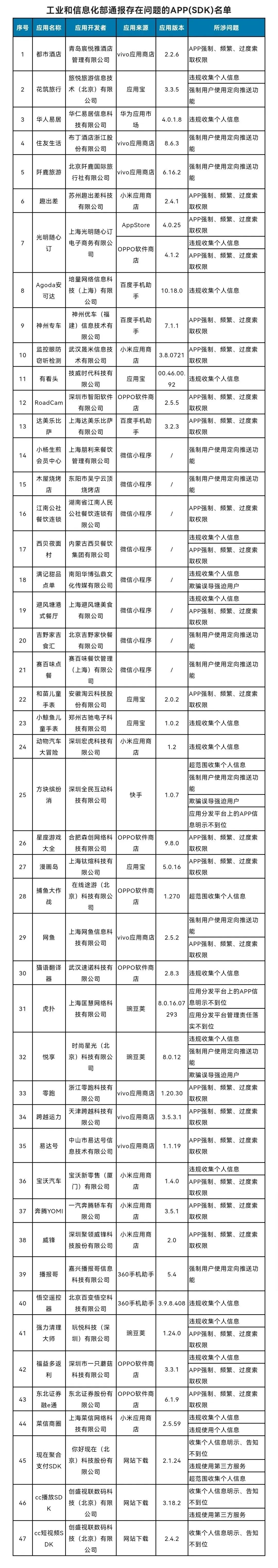 截至目前,尚有47款APP(SDK)未按要求完成整改,现予以通报。